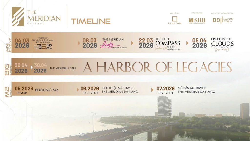 The Meridian Đà Nẵng đang định hình trở thành biểu tượng sống mới bên dòng sông Hàn thơ mộng, nơi mà sự xa hoa gặp gỡ nhịp sống hiện đại của thành phố đáng sống nhất Việt Nam. Với lộ trình sự kiện 2026 được công bố chi tiết qua timeline ấn tượng, dự án không chỉ là một khu căn hộ cao cấp mà còn là hành trình dài hơi, khơi dậy khát vọng sở hữu và trải nghiệm đỉnh cao từ chủ đầu tư Landcom – đơn vị uy tín với sự hậu thuẫn tài chính vững chắc từ các đối tác lớn như SHB, cùng sự đồng hành của DDI YourHome và các tên tuổi hàng đầu trong lĩnh vực bất động sản.